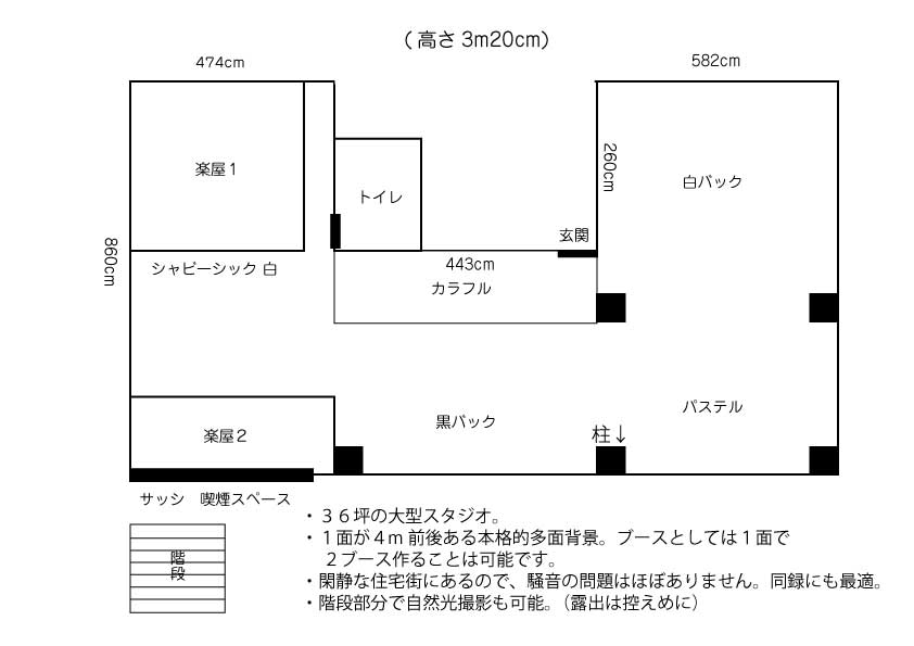 広さは36坪、天井高は3.2mの広々とした空間でスタンダードな白ホリをはじめ、黒バック、パステル、シャビーシックといった背景が8面。サイズも4m前後、高さは3m以上を確保しており本格的な環境となっています。