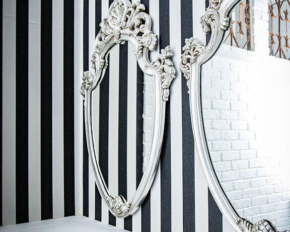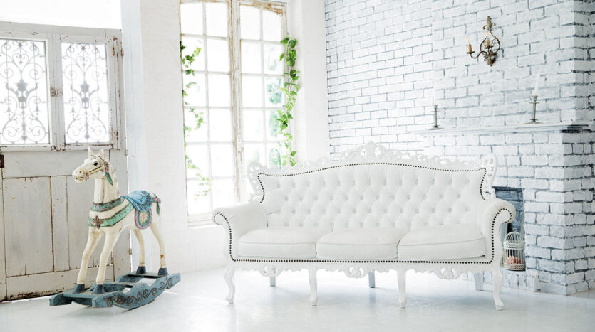 インテリアには、シャビーシックな暖炉や重厚感のあるシルバーフレームミラー、フランスのアンティーク建具、多彩なデザインのウインドウなど、センスあふれるアイテムをセレクトしています。ソファやチェアなどの家具、フレンチ小物などの小道具も豊富に揃っています。