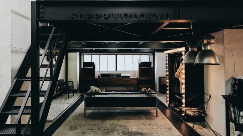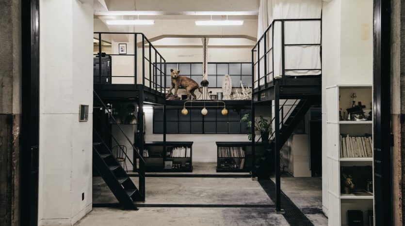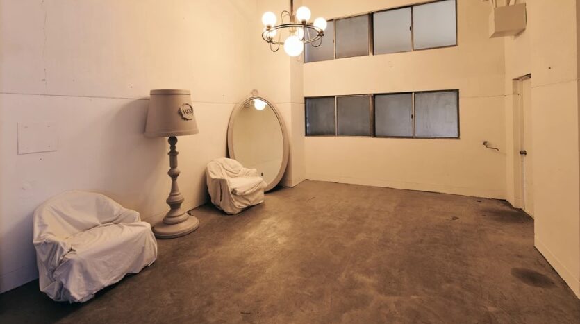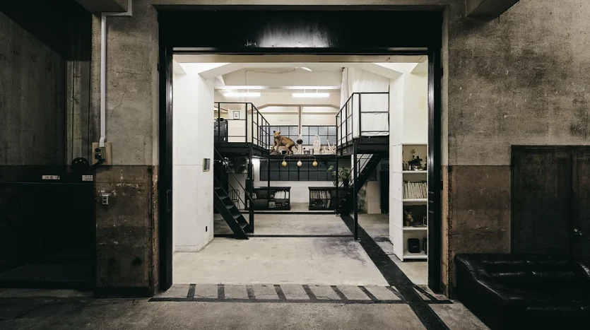 ガレージ&ロフトは、ロフトスペースが特徴的でNYウェアハウスのような雰囲気です。こだわりの上質なヴィンテージ家具やシャッター、コンクリートの床や白壁も背景としてよく映えます。