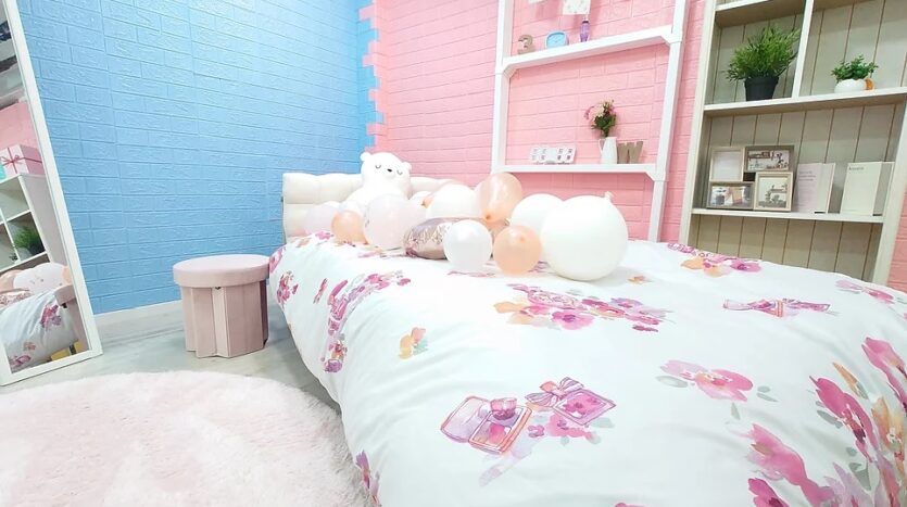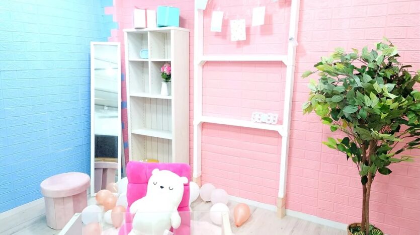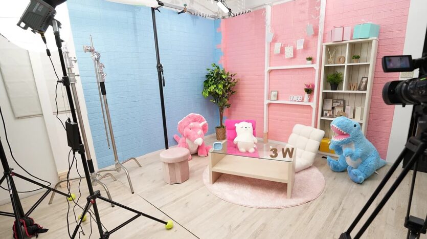 撮影スタジオは2カ所あり、Aスタジオはグレーの壁と木目調の床でシンプルなスペース。白やグリーンバックでも撮影可能です。Bスタジオはピンクとブルーのパステルカラー壁をアクセントにした、ガーリーな雰囲気が特徴です。この他2階には打合せスペースや撮影配信オペレーションコーナーもあります。