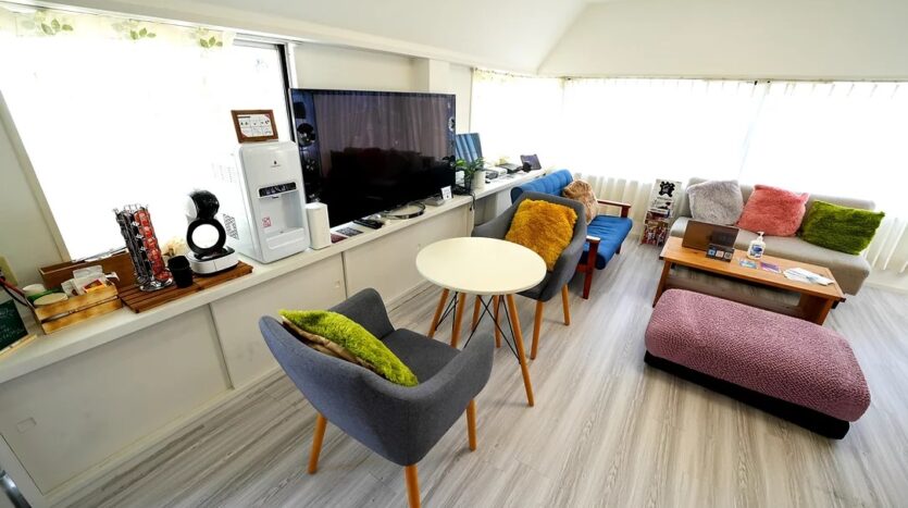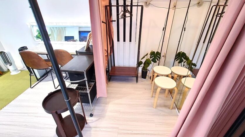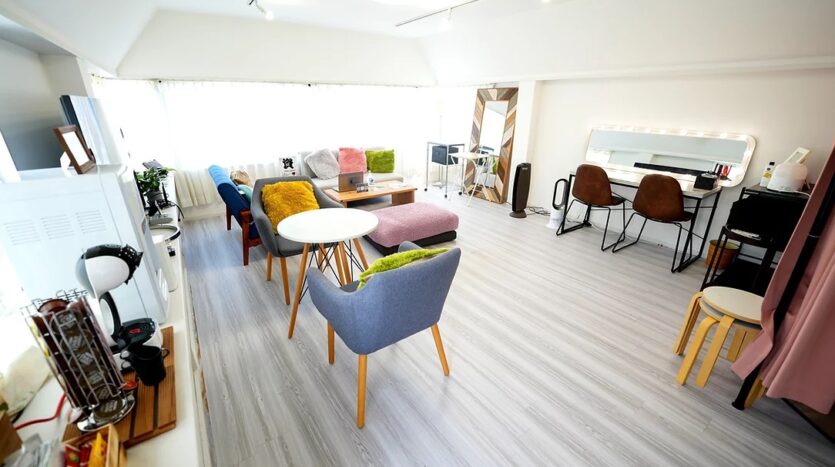 リビングのようなくつろいだ雰囲気のフリースペースがあり、チェアやテーブルなどのセットもあるので小規模の撮影配信に便利。2階の撮影風景のモニタリングに活用することもできます。また3階ではメイクルームやフィッティングルームも完備しています。