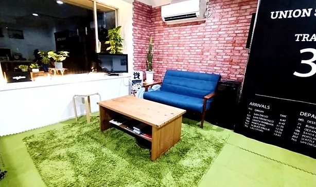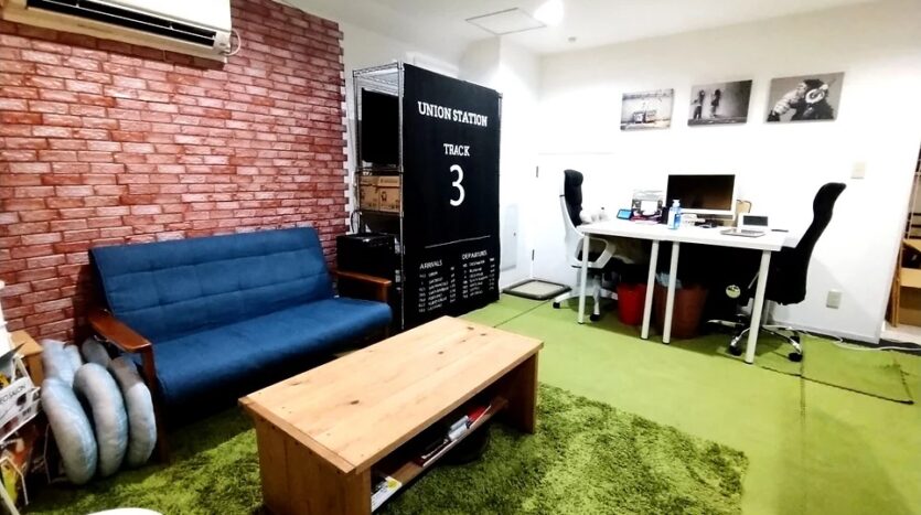 レンガ風の壁とグリーンのラグをアクセントに、フリースペースとソファーを設置した空間。撮影だけでなく、打ち合わせや作業スペースなど多目的に利用できます。