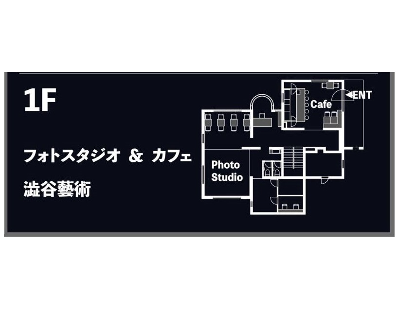 館内は1階にフォトスタジオとカフェ、2階にはギャラリーとオフィスを併設した複合施設です。