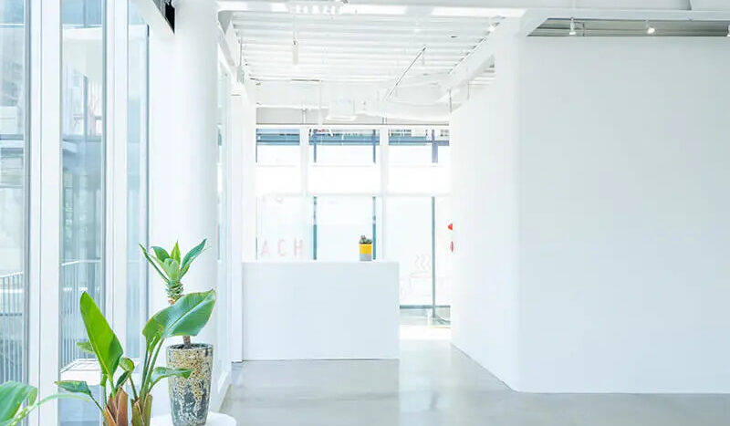 面積120平米、天井高は3.6mもあるスタジオ内は、白壁にモルタルフロアで構成されています。シンプルかつミニマルな空間をさらにおしゃれに見せているのが、全面ガラス張りの設計。日差しがスタジオ全体に広がり、明るく開放的な雰囲気を演出しています。