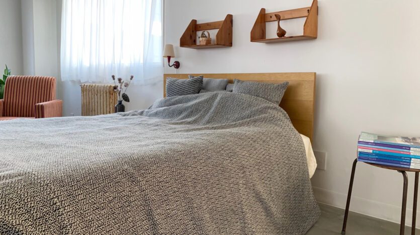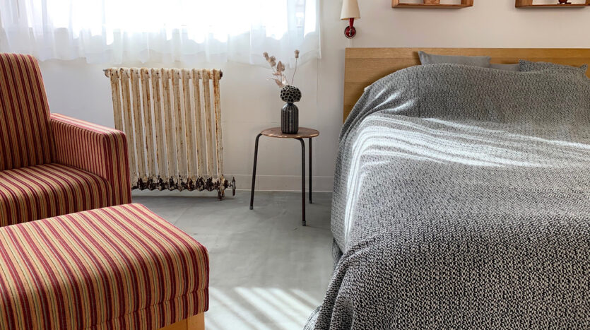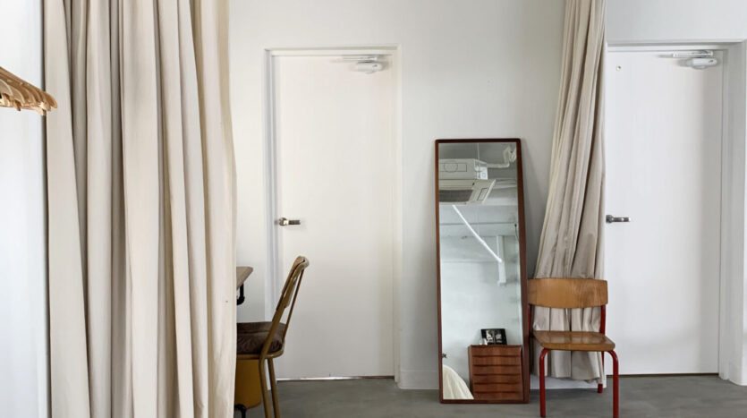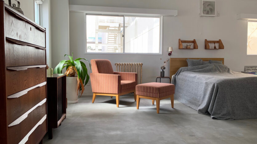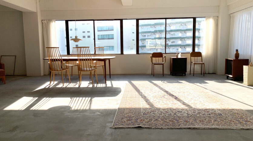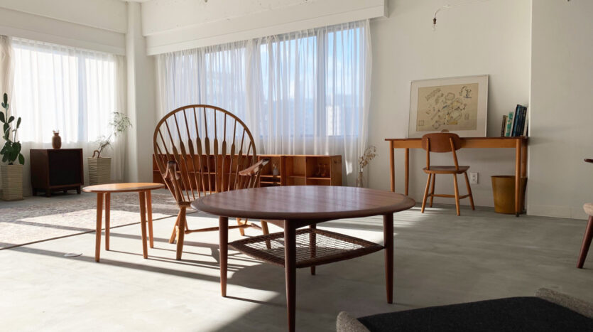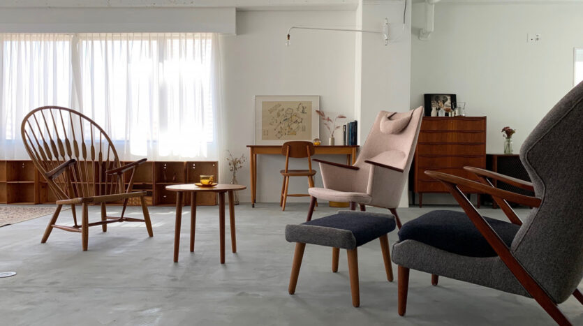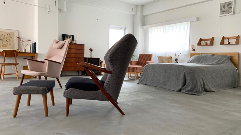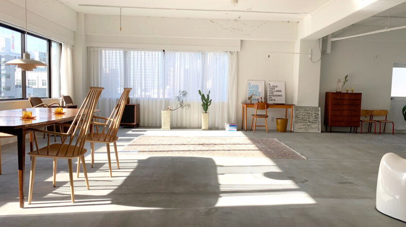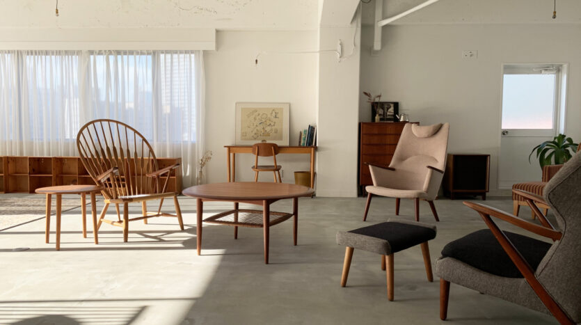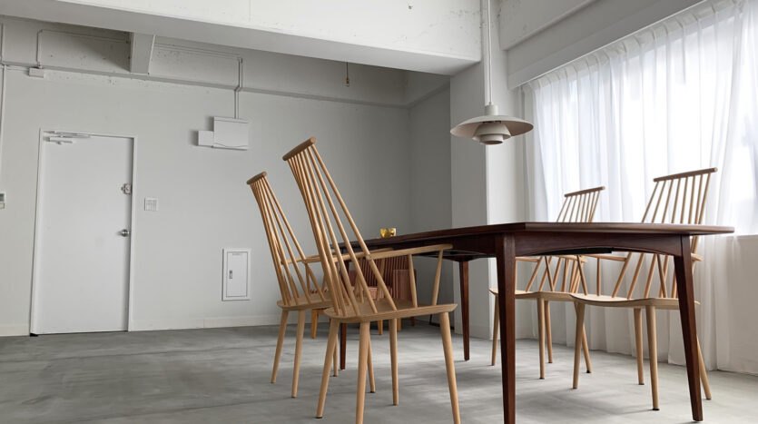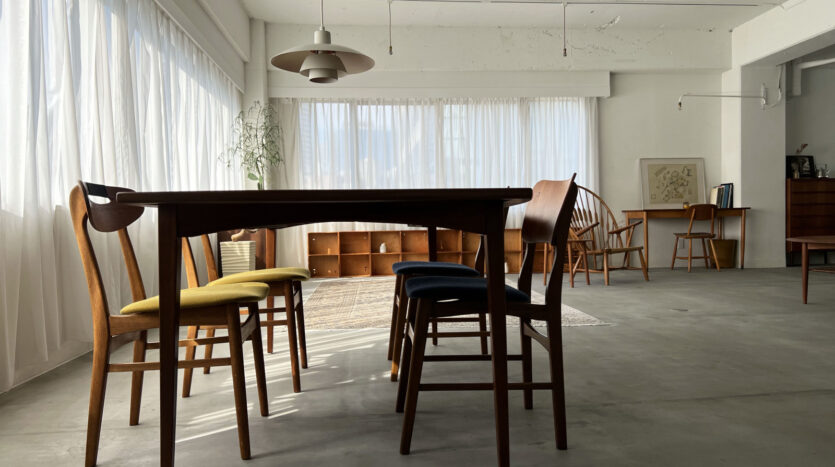 5階建てのビルの最上階に位置するスタジオは陽当たり良好で、110㎡の広いスタジオ内に自然光が豊富に入ります。真っ白に塗られた壁、モルタル床にハンズ・ウェグナー、カイ・クリスチャンセン、ウェンデル・キャッスル、ヨハネス・ハンセンといった著名なデザイナー達による貴重なヴィンテージが備えられています。