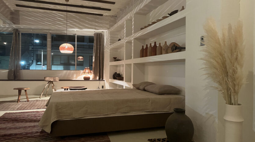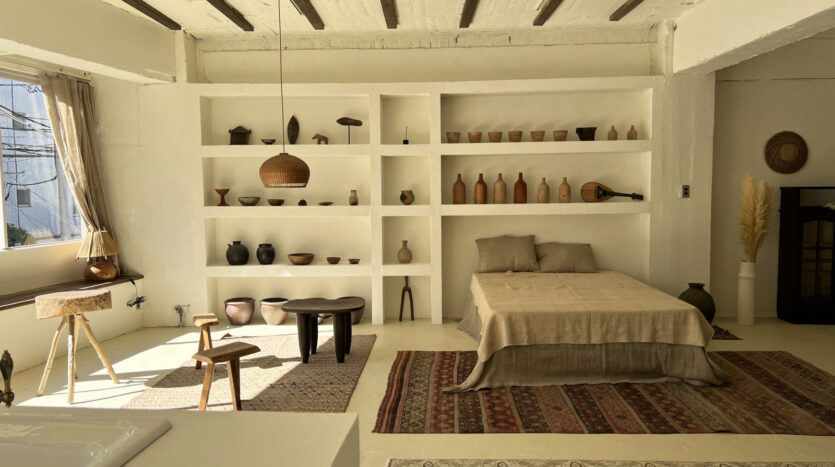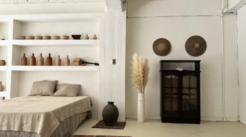 白を基調とした室内の壁は、国内の高品質原材料を使用した100%自然素材で作られた漆喰というこだわり。家具にも自然な素材感を大切にした飾り気のないものが取り揃えられ、シンプルでプリミティブな空間に仕上げられています。
