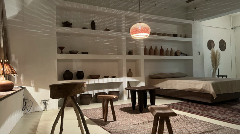 まず室内で目につくのが、壁一面を使って作られた飾り棚。素材感を大事にした素朴な花器などの器が並びます。