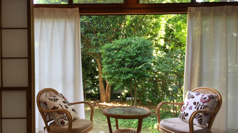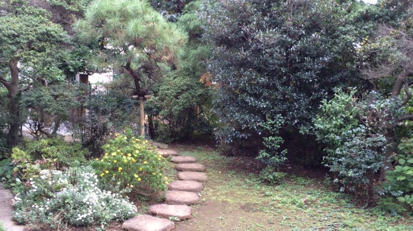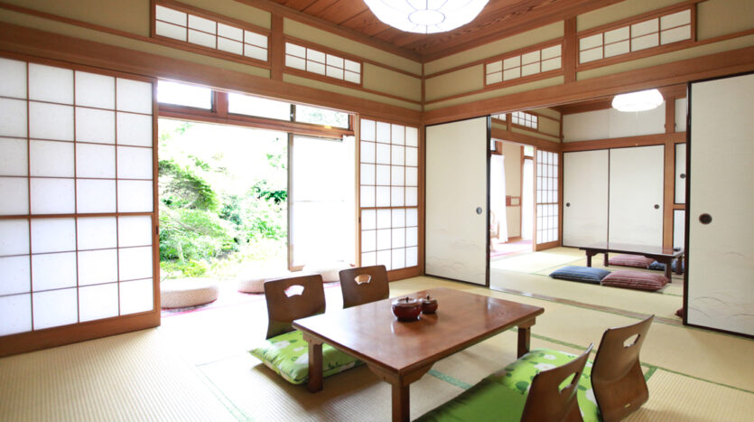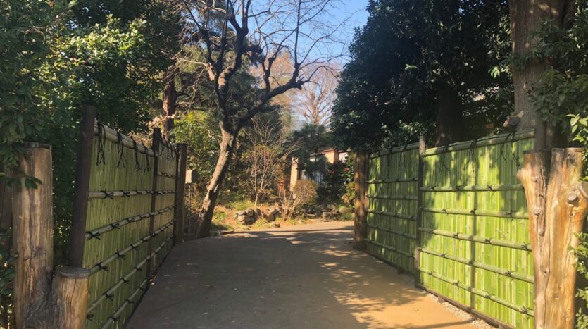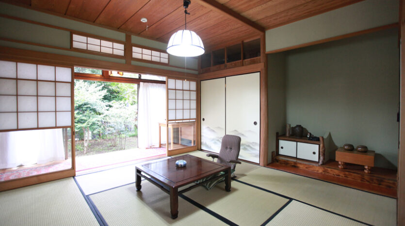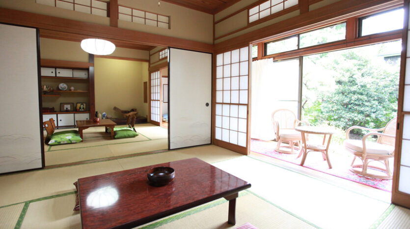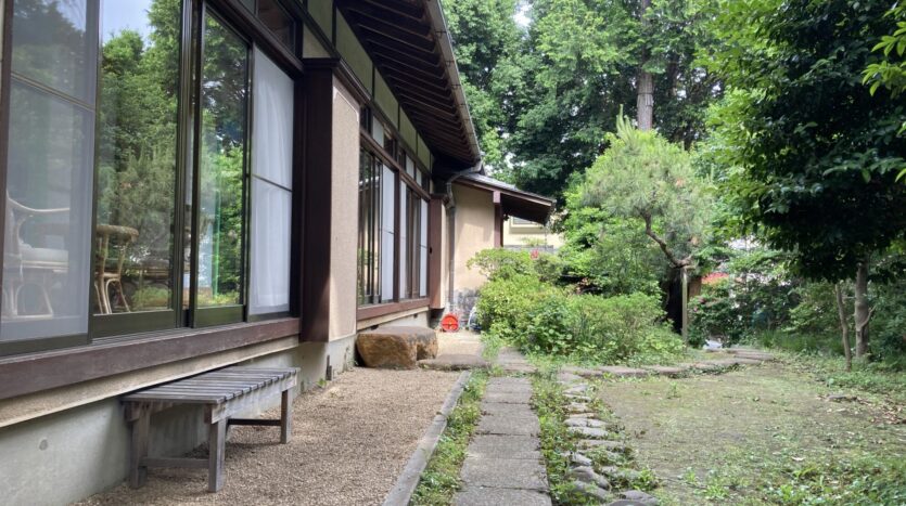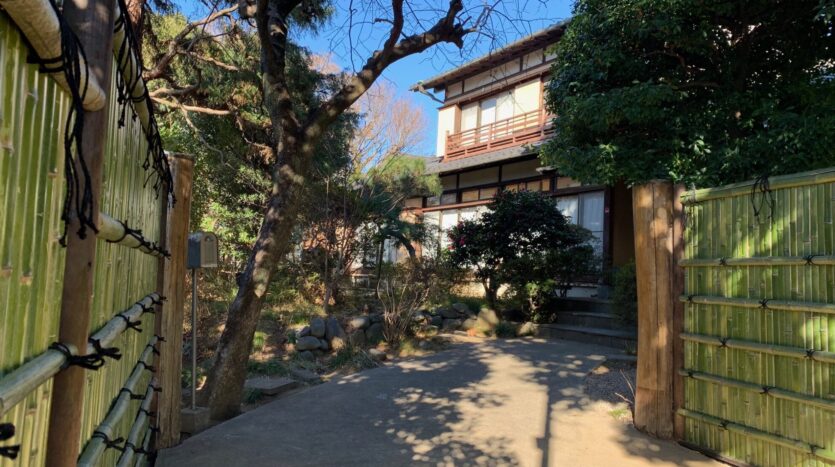 今では見ることが少なくなった二間続きの和室とその奥にも8畳の和室があり、縁側から障子越しに柔らかな光が射し込みます。この和室から縁側に目を向けると都内と思えないようなたくさんの木々に囲まれた広い庭を楽しむことができます。玄関は広々とした旅館風の造りとなっており、公道から続く竹垣のある敷地内通路が高級料亭を思わせます。