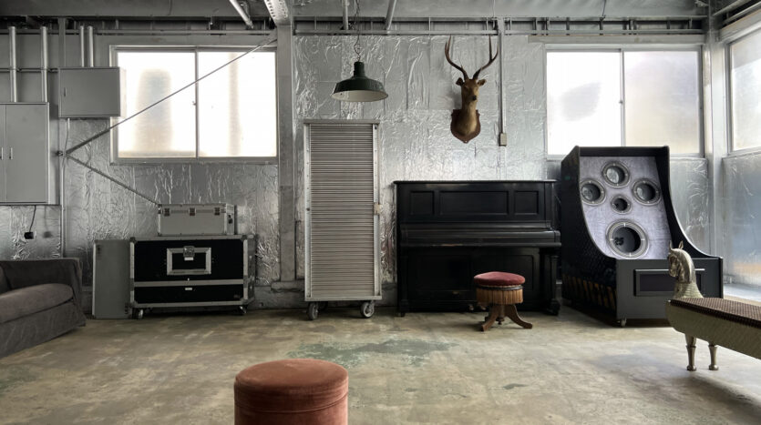 160㎡の広々としたスタジオは、壁・天井、仕切りにも使えるスクリーンカーテンにいたるまでシルバー色に彩られ、メタリックでモダンな空間を生み出しています。用意されているプロップもシルバー色が採用され、その中で100年前のピアノをはじめ、アンティークな家具やモダンな家具が混在することで異彩を放っており、良いアクセントとなっています。撮り手の創造力をかきたてられるスタジオです。