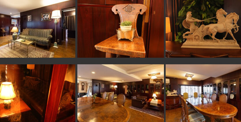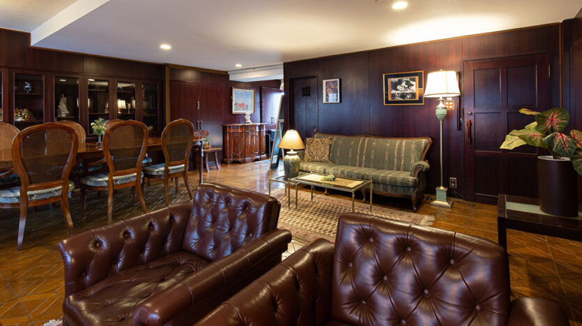寄木で構成された高価な床材にダークな色合いに統一された木製壁材と埋め込み式の大型キャビネット、品のよい英国製のアンティークな家具に囲まれた空間は、英国紳士が集うサロンを彷彿させるような空間となっています。日中は自然光にあふれ、夜間はムードたっぷりの間接照明がラグジュアリーを演出します。