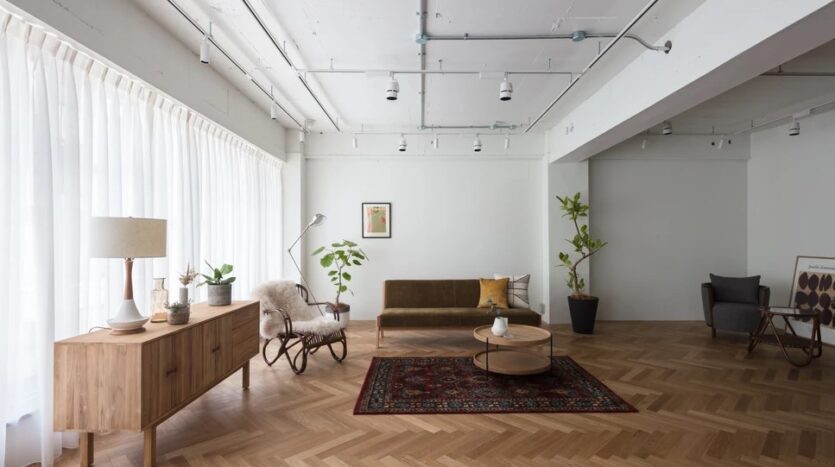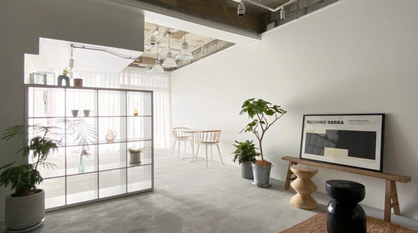 モルタル床とスケルトンの天井、白壁のシンプルな構成にナチュラルモダンな家具や小物が並べられ、商品の物撮りやポートレート撮影、ショップやカフェのシーンに向いています。 - 2F
