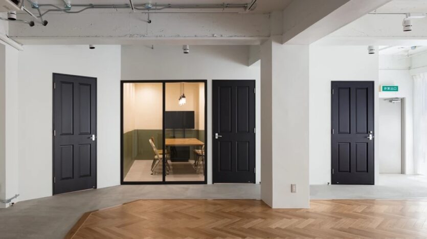 土日祝に利用できるオフィススタジオは一面に敷かれた市松張りの床材が温かみを感じさせる空間となっています。デザイン事務所のリアルオフィスのため、 おしゃれなオフィス空間での撮影に最適です。 - 3F