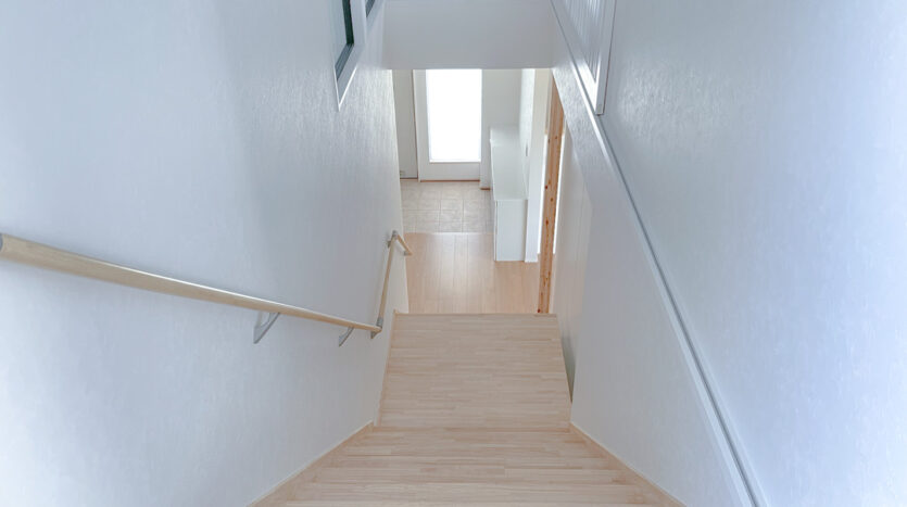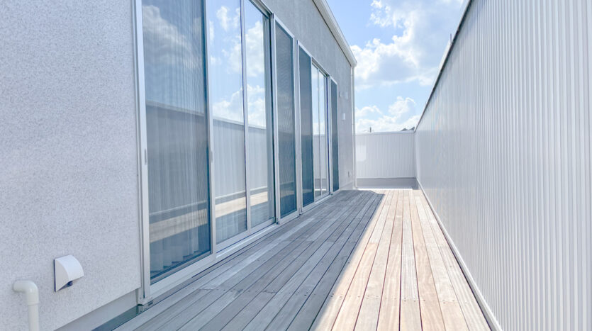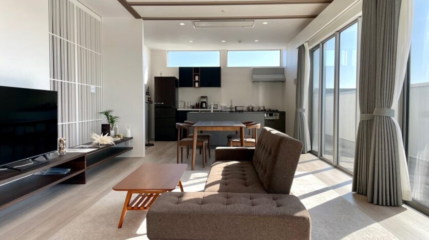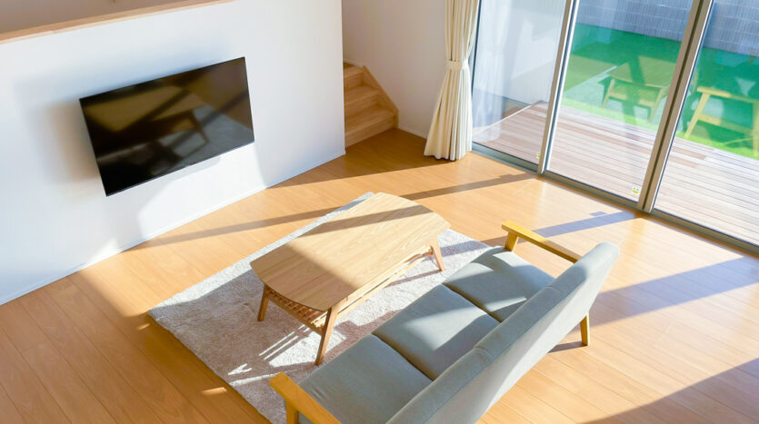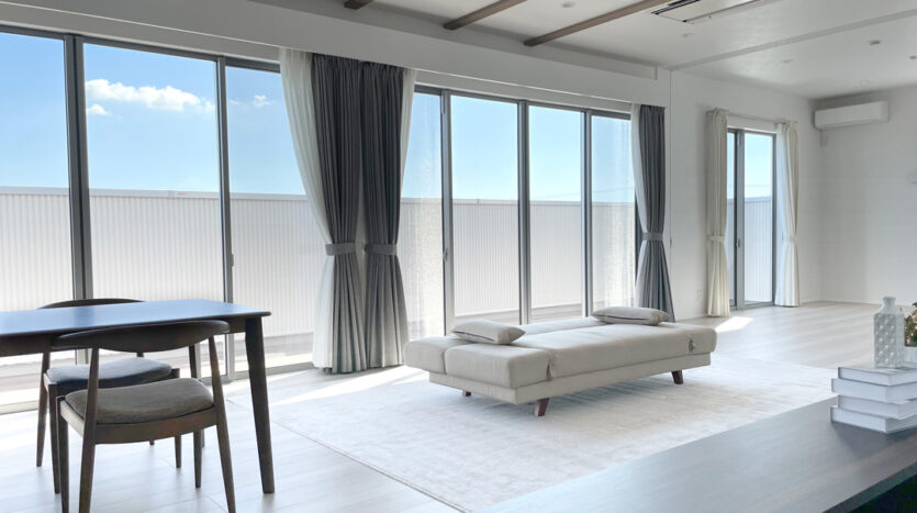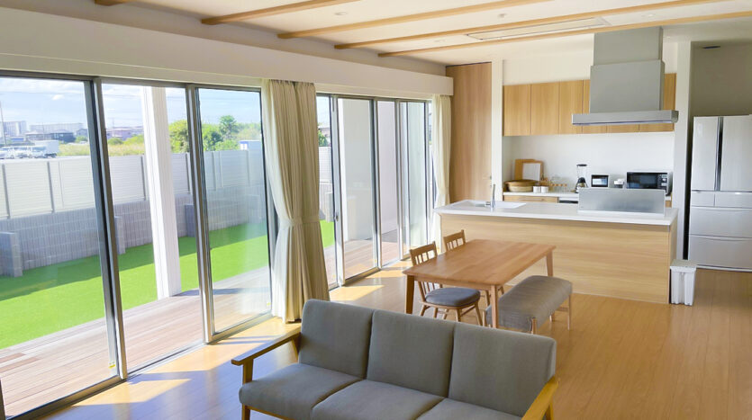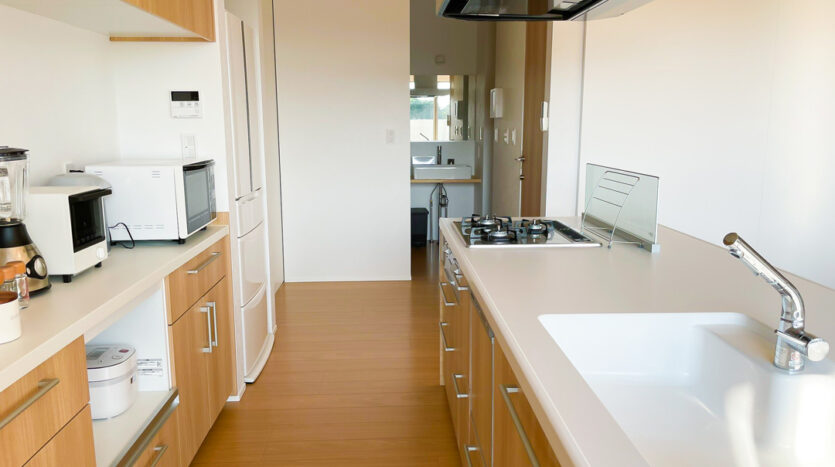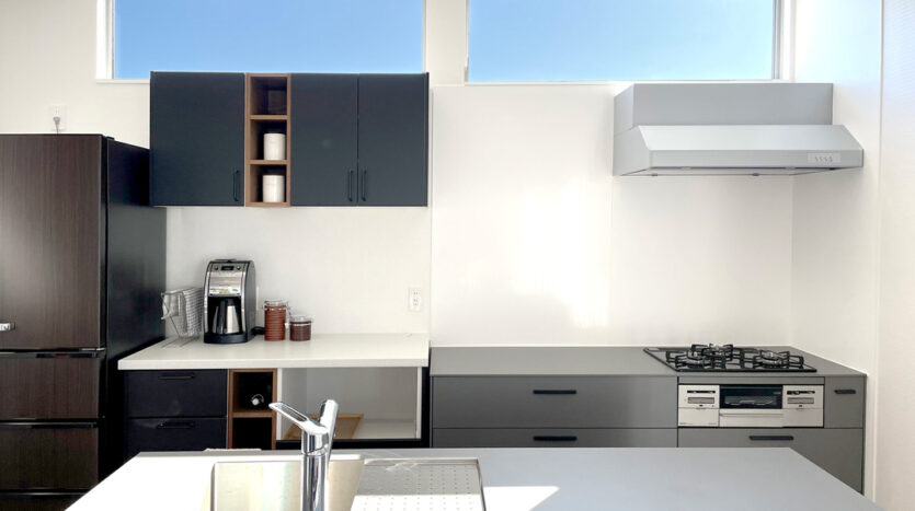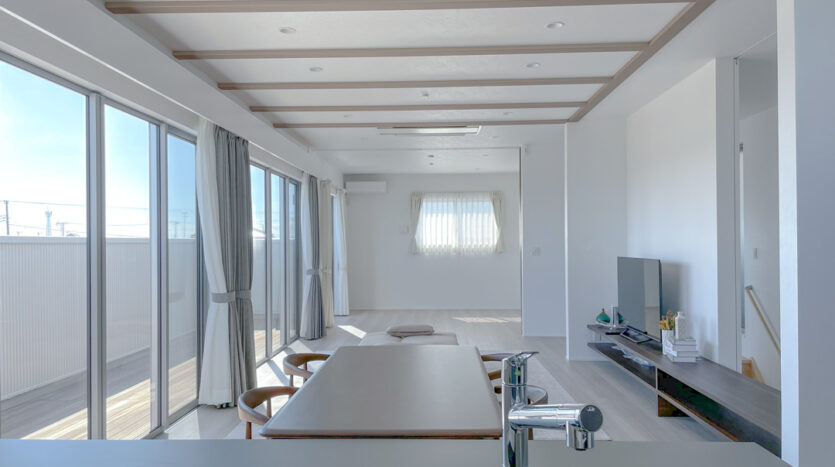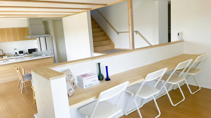 1階は床とアクセントにライトブラウンを使ったナチュラルテイスト。南面の8mを超える間口と1.8mもの奥行があるテラス越しに自然光が降りそそぎ、日中を通して明るい空間となっています。また、大型のカウンターキッチンが備えられ、ファミリーユースの撮影にも利用できます。