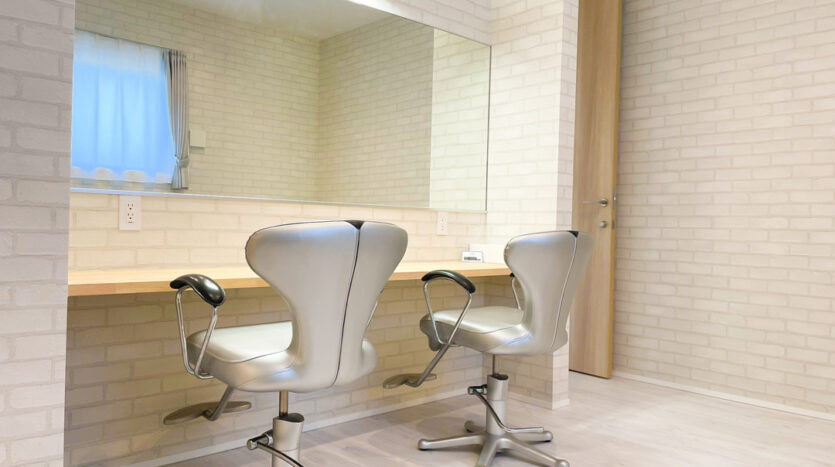 階段部分を隠すスライディングウォールや収納可能な間仕切り戸など工夫が施され、背景のバリエーションを増やせるほか、メイクルームも十分な広さがあり、モデルを使った撮影や大人数の撮影にも対応できるスタジオとなっています。