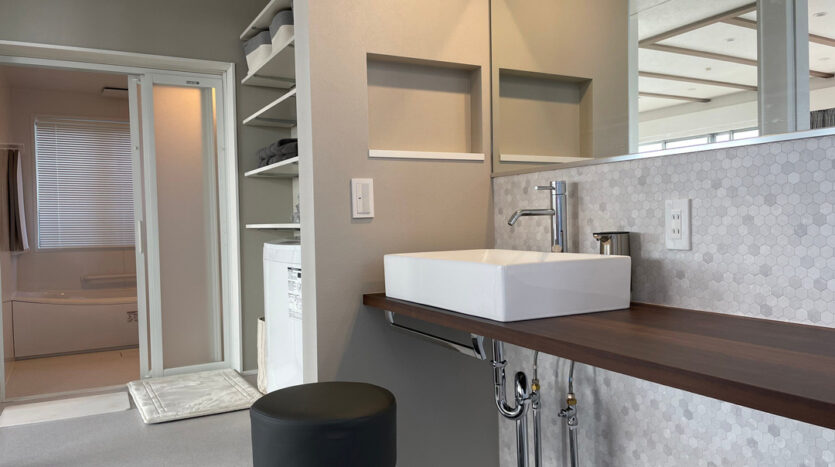 2階はグレー系のブラウン色でまとめられ、シックでスタイリッシュな空間。広々としたサニタリースペースとバスルームが備えられ、さまざまな撮影シチュエーションに対応できます。