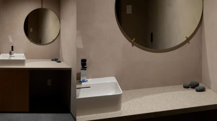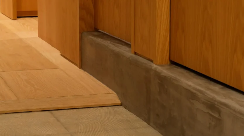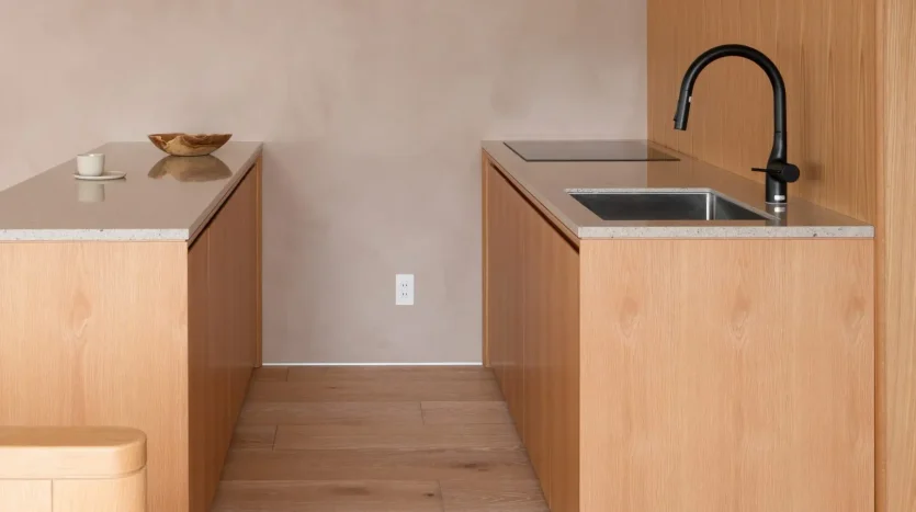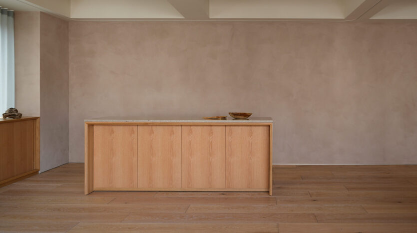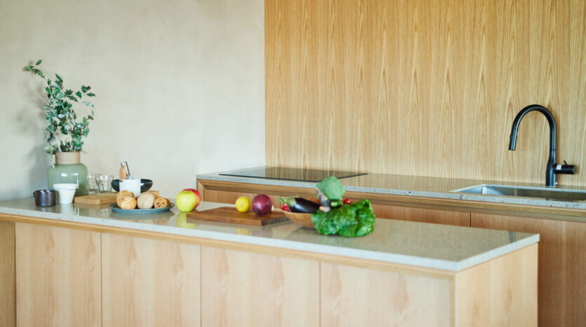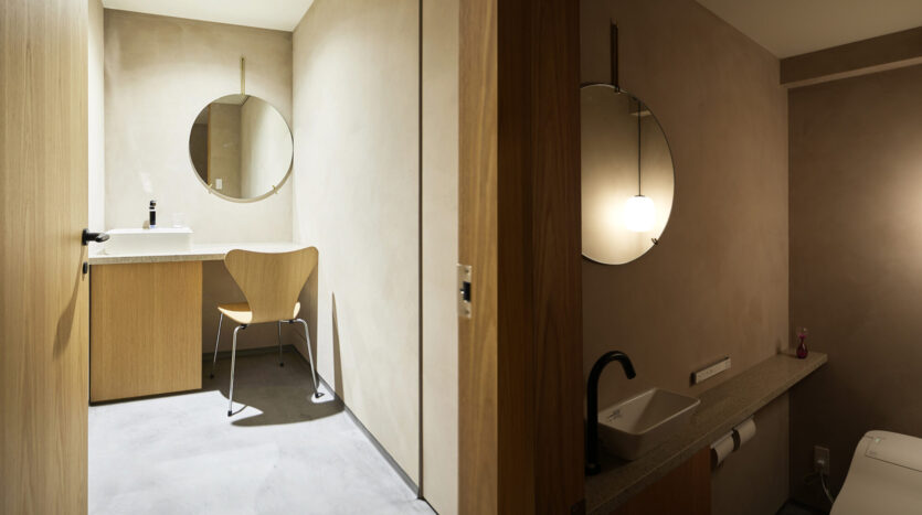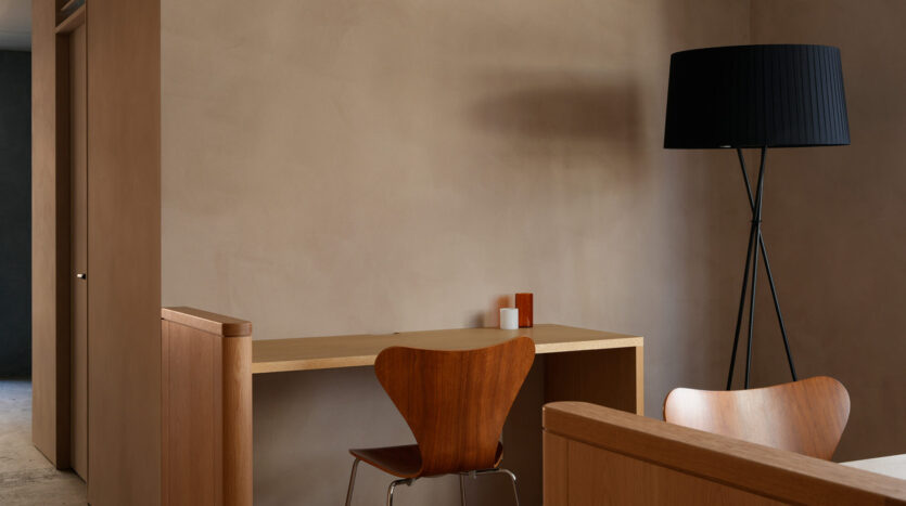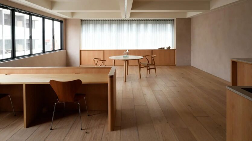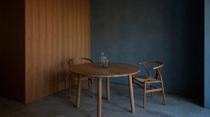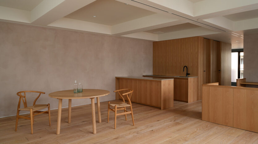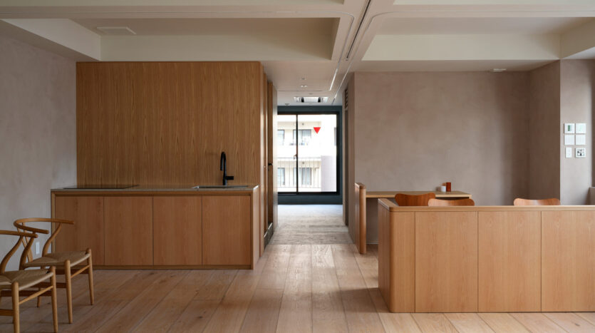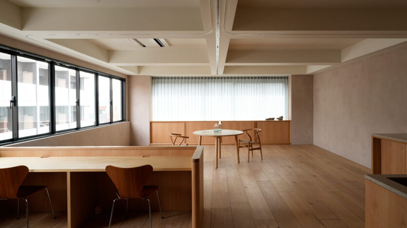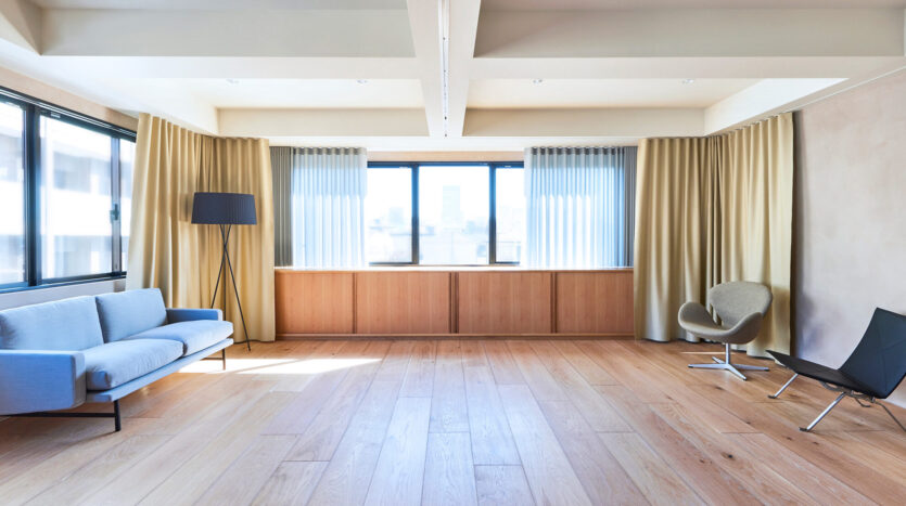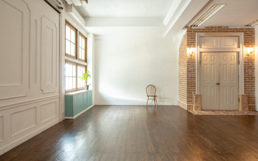 周囲に視界を遮るものがないスタジオは、東面と南面から自然光が降りそそぎ、北欧家具ブランド「フリッツハンセン」の曲線が優しい家具と素材感があるライトブラウンの無垢の床材とあいまって、質の高いナチュラルモダンな空間を演出しています。壁色も優しい風合いの薄いライトブラウンとブルーブラウンで塗分けられ、背景が主張することなく被写体を引き立てます。モデルを使ったポートレート、物撮りのほか、大型のカウンターキッチンを使った調理シーンや、完備されたWi-Fiを使った動画配信など、様々な撮影シチュエーションで利用できるハウススタジオとなっています。