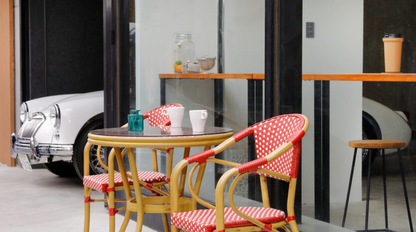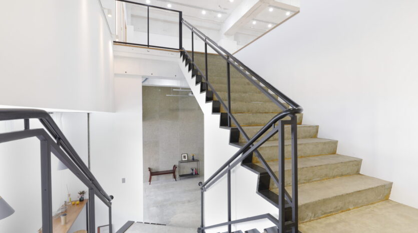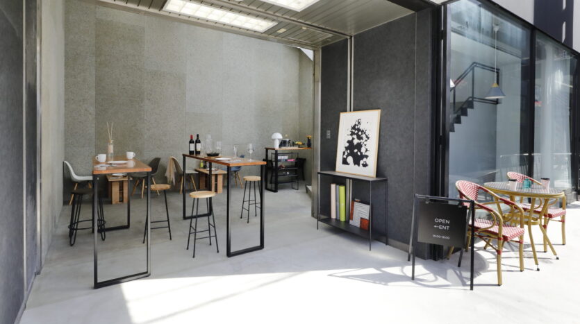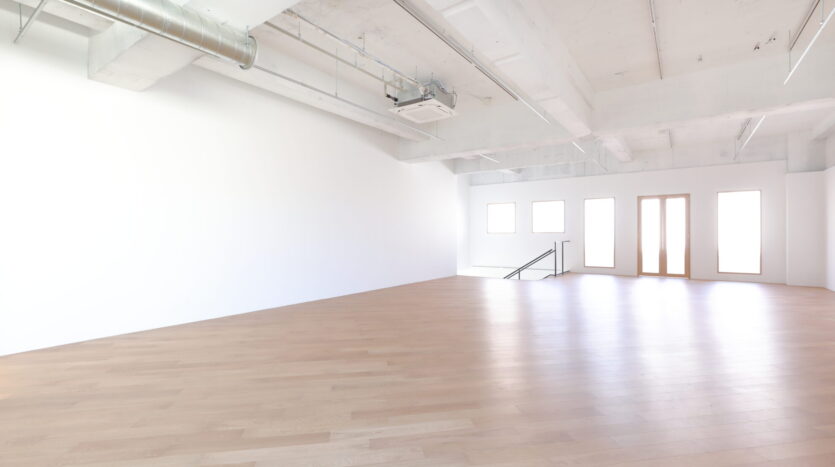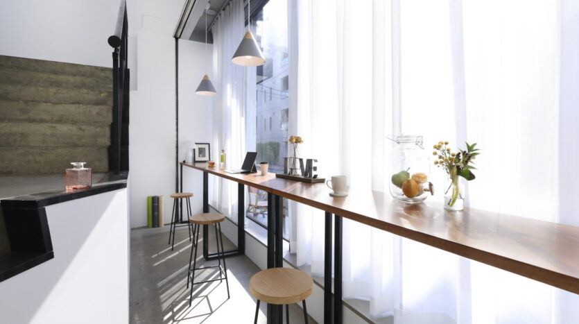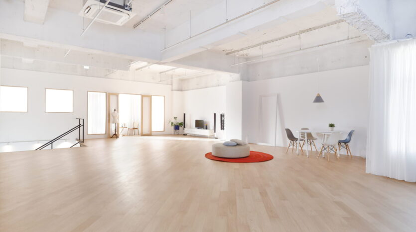 2スタジオは、窓際のカウンターテーブルが印象的なカジュアルなカフェエリアとライトブラウンの床材が敷き詰められたスペースがメゾネットとなった162㎡のスタジオ。カフェエリアでは、カフェシーンや物撮り、フローリングエリアでは、ダイニングテーブルやソファを使って生活シーンの撮影やオフィスシーンの撮影にも利用できます。